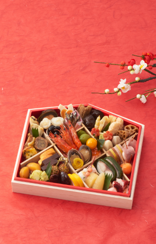 からすみ(オーストラリア産)、椎茸旨煮 、蟹水車巻(風味かまぼこ、大根、紅ズワイガニ、その他)、牛肉小袖巻、子持鮎昆布巻、伊達巻、南高梅白板昆布巻、海老雲丹真丈、海老真丈、帆立醬油焼、海老旨煮、丹波産黒豆、博多焼チーズ風味、海老芋旨煮、サーモン手毬、北海道産味付数の子、国産とこぶし旨煮、合鴨かんざし、小柱と烏賊の卵紅白和え、金柑 、栗金団、銀鮭塩麴焼、焼きふぐ、炙りのどぐろ松葉、筍旨煮、若桃甘露煮、重ね鯛昆布〆、焼栗ブランデー風味、帆立貝柱まったり和え、つぶ貝しぐれ煮、葉わさび松前漬、メープルくるみ、甲烏賊の金柑黄金和え、雲丹チーズソース寄せ、海老雲丹松葉串、蓮根旨煮、丸穴子南蛮漬、銀鮭塩麴和え、くわい柚子胡椒和え、湯葉柚香煮、紅白なます、菜の花お浸し、粟麩、蓬麩、百合根甘露煮、海老真丈、蟹真丈、たたき牛蒡、紅白かるかん、杏子甘露煮、金時人参、紫花豆密煮、姫竹旨煮、金柑、網笠柚子、いくら、田作り、紅白餅串、寿昆布扇子/調味料(アミノ酸等、有機酸等)、加工デンプン、酒精、着色料(カラメル、カロチノイド、クチナシ、紅麴、赤3、赤102、赤104、青1、黄4,黄5)、ソルビット、糊料(加工デンプン、増粘多糖類、グァーガム、キサンタンガム、セルロース、ローカストビーンガム)、トレハロース、乳化剤、pH調整剤、酸味料、酢酸(Na)、香料、甘味料(ステビア、ソルビット、スクラロース、甘草)、グリシン、保存料(しらこたん白、ポリリジン、ソルビン酸K)、野菜色素(トマト色素、パプリカ色素)、ポリリン酸Na、酸化防止剤(亜硫酸Na、ビタミンE、ビタミンC)、ビタミンB1、酵素、ショ糖脂肪酸エステル、酒精、カラシ抽出物、漂白剤(亜硫酸塩、次亜塩素酸ナトリウム)、メタリン酸Na、発色剤(亜硝酸Na)、重曹、硫酸第一鉄、
